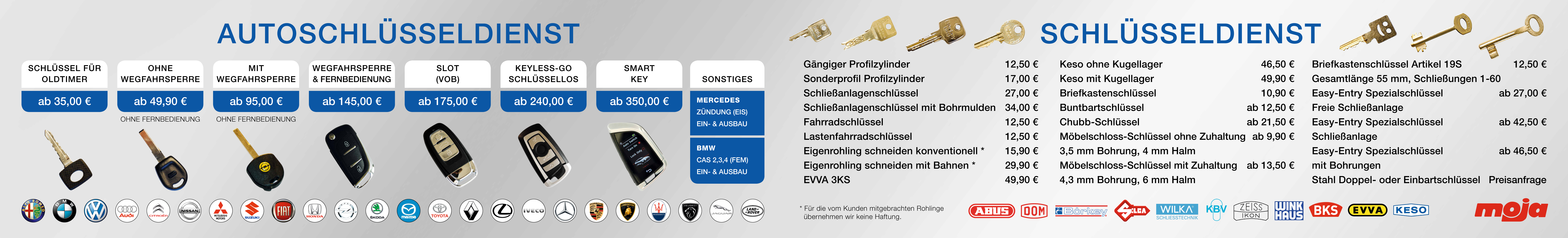 Zudem bieten wir unseren mobilen Autoschlüsseldienst im Umfeld Münchens an. Wir reparieren oder fertigen Ihren Autoschlüssel bei Ihnen vor Ort. Dabei fällt eine "Allgemein Betriebskostenpauschale" von 60.- Euro an.