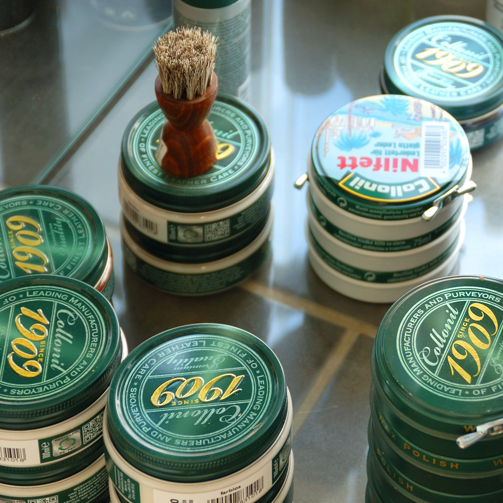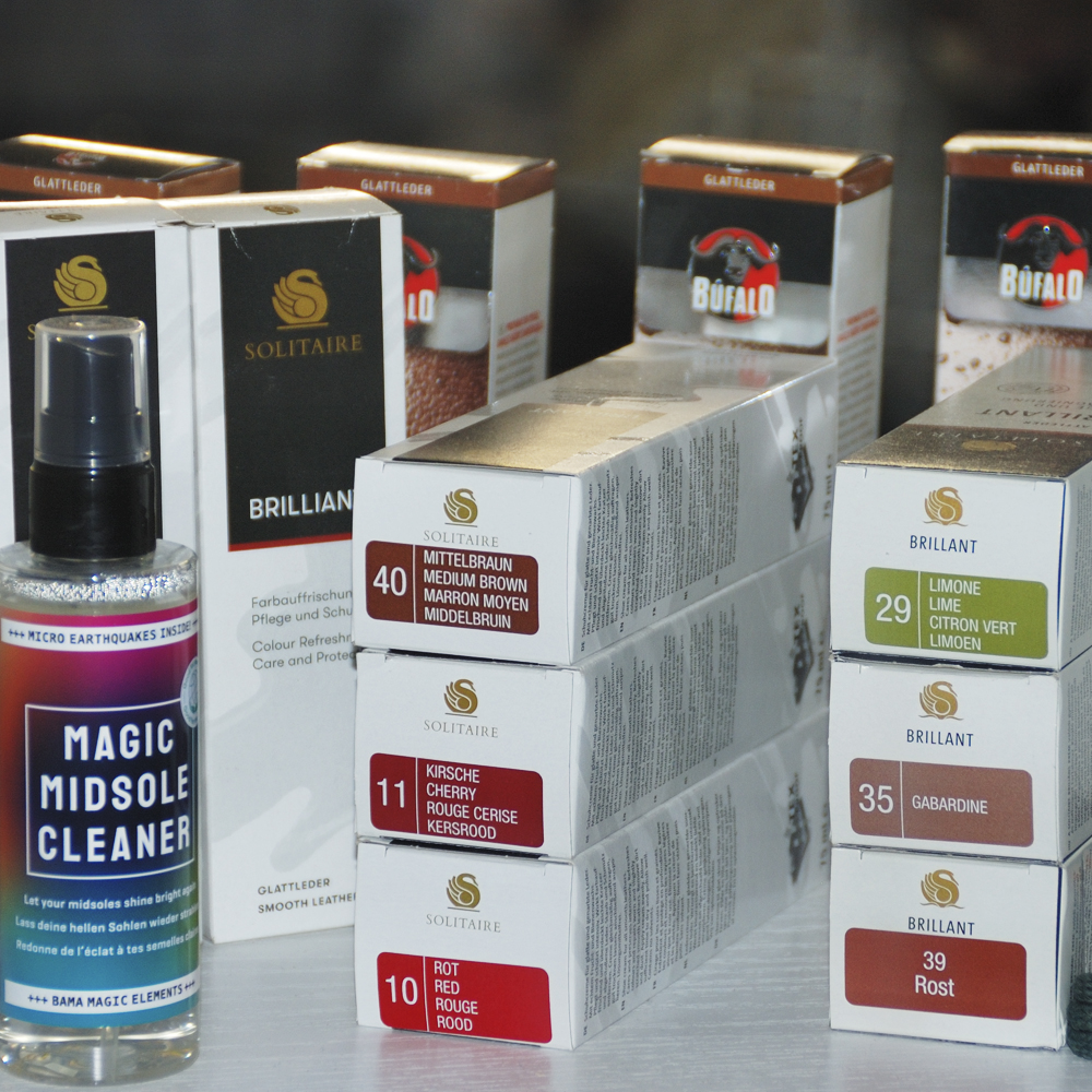 Wir führen eine Reihe von Furnituren wie Schuhcreme, Reinigungsspray, Imprägnier-Spray, Schnürsenkel, Treibleisten, Schuhspanner und Schuhanzieher.